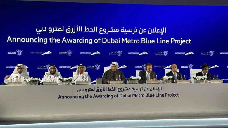 أعلنت هيئة الطرق والمواصلات في مدينة دبي الإماراتية، ترسية عقد بقيمة 20.5 مليار درهم (نحو 5.6 مليار دولار) لمشروع الخط الأزرق لمترو دبي على تحالف من ثلاث شركات تركية وصينية، حسب منشور على حساب مكتب دبي الإعلامي عبر منصة (X) اليوم الخميس.
