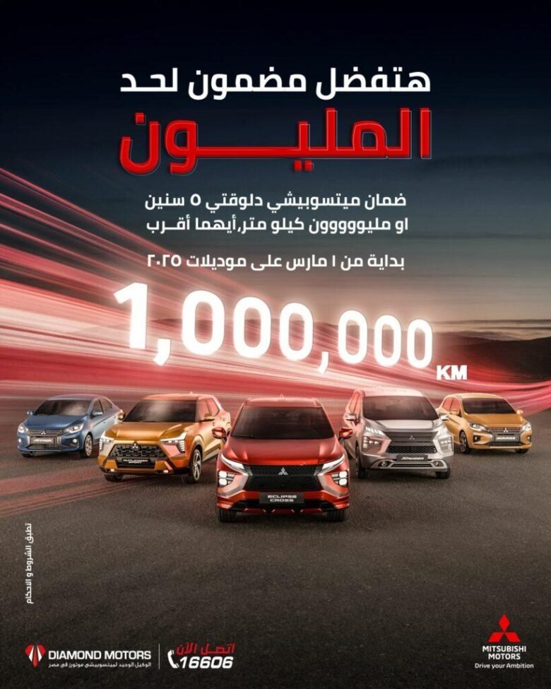 أعلنت شركة دايموند موتورز، الوكيل الحصري لميتسوبيشي موتورز في مصر، عن ضمان جديد وغير مسبوق يمتد لمدة 5 سنوات أو مليون كيلومتر (أيهما أقرب)، على جميع موديلات ميتسوبيشي 2025، وذلك اعتبارًا من 1 مارس 2025، ليكون الضمان الأقوى والأعلى في فئتها في السوق المصري